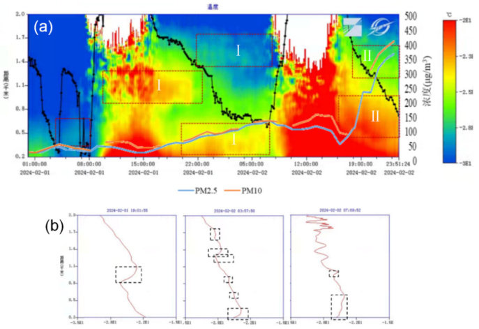 (图(a)为雷达所测得 2024 年 2 月 1 日—2024 年 2 月 2 日温度及对应时间段内雾霾浓度变化,图中用红色框线圈出地方为逆温层顶,图中标记Ⅰ、Ⅱ分别代表第一次与第二次雾霾事件期间的逆温层顶高度。;图(b)为 2024 年 2 月 1 日 15 时—2024 年 2 月 2日16 时期间对应典型逆温时段雷达温度廓线图)