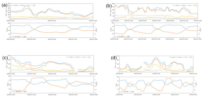 (上图为空气污染物浓度曲线图,下图为对应时间段内空气温湿度。其中图 a 为 2025 年 1 月 20 日 0 时—1 月 22 日 0 时空气污染物浓度与温湿度对比图;图 b 为 2025 年 1 月 24 日 0 时—1 月 27 日0 时空气污染物浓度与温湿度对比图;图c 为2025 年2 月11 日0 时—2 月 13 日 0 时空气污染物浓度与温湿度对比图;图 d 为 2025 年 2月9 日0 时—2 月13 日0 时空气污染物浓度与温湿度对比图)