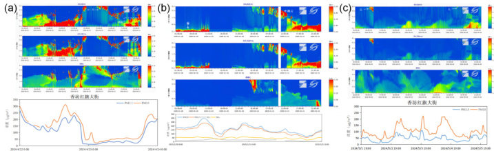 图5 不同天气现象对应空气污染物浓度变化(上图为由多光谱拉曼雷达获得的气溶胶光学特征,下图为对应时间段内污染物浓度。其中图a 为降雨对应空气污染物浓度变化;图b 为冰云对应空气污染物浓度变化;图c 为云对应空气污染物浓度变化)