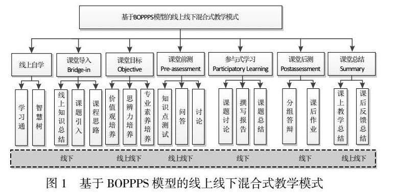 将BOPPPS教学模型融入线上线下混合式《中国画基础》教学,旨在通过精心的教学设计与改革实践,达成优质的教学成效,符合两性一度(即高阶性、创新性与挑战度)的“金课”标准。这一教学模式的重构,不仅强化了学生的学习主体地位,也充分发挥了教师的引导作用,为传统教学模式带来了革新。设计基于BOPPPS模型的线上线下混合式教学模式,结构图如图1所示。