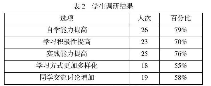 通过教师、学生访谈和课堂观察等途径,笔者对课程的混合式学习实施情况进行了深入的调查,并对进行混合式教学的一个教学班共计33人进行调研,如表2所示。