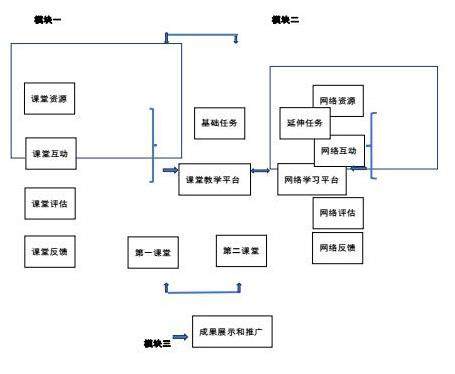 模块一:课堂教学平台。此平台由四个系统组成,即课堂资源、课堂互动、课堂评估、课堂反馈组成。 课堂资源主要是指学生使用的教材、教师参考书以及其他课外资料;课堂互动是教师与学生之间、小组成员之间、组与组之问的相互沟通和交流。学生根据掌握的课堂资源输出信息;课堂评估采用教师评价、自评和生生互评的方式进行;课堂反馈即教师对各个小组活动进行现场反馈及事后反馈。