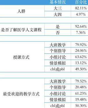 本次调查研究对503份有效问卷的学生年级、对医学人文课程的了解程度进行统计描述。结果显示,调查人群当中,群体大多数听说过医学人文课程,对医学人文课程具有初步的了解,而现阶段的医学人文课程教学模式在调查当中,超过半数的授课模式是大班教学,而还有百分之四十的群体采用cbl或pbl。目前为止,在回收的问卷当中最被喜欢的授课方式是大班教学,其次是个别指导和情景模拟,最不受学生欢迎的是cbl或pbl。