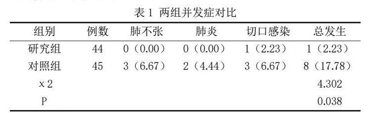 选取2023年1-12月年10月医院择期行胸外科手术的患者40例,用随机数表法分为对照组(45例)、研究组(44例)。对照组:男26例,女19例;年龄27~76岁,平均年龄(51.24±2.63)岁;胸腔镜手术28例。研究组:男24例,女20例;年龄27~78岁,平均年龄(52.43±2.67)岁;两组基础资料对比,差异无统计学意义(P>0.05),有可比性。