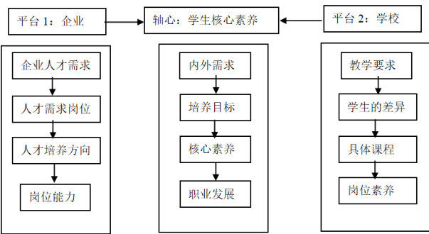 基于 OBE 教育理念的“一轴心两平台”育人模式(见图 1)就是以学生核心素养培育为轴心,通过企业和高职院校两平台共同协作育人。“一轴心”是指培育学生的核心素养,整合各学科知识、能力、文化的核心素养。“两平台”是指通过企业和高职院校通力合作,根据市场需求有针对性地培育学生的核心素养。
