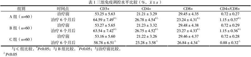 三组治疗前T淋巴细胞水平无统计差异(P>0.05);三组治疗6个月后T淋巴细胞水平得到明显改善;A组及B组干预6个月后T淋巴细胞各水平无统计差异(P>0.05);A组及B组CD3+、CD4+、CD4+/CD8+水平高于C组(P<0.05);CD8+水平低于C组(P<0.05),见表1。