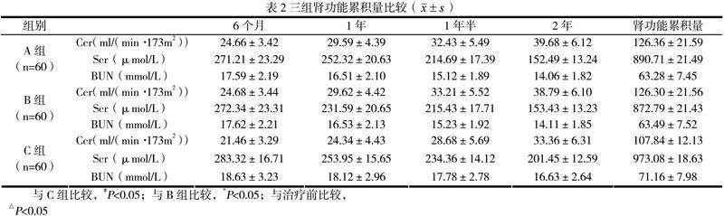 三组随着时间延长肾功能及累积量得到明显改善;A组与B组治疗后6个月、1年、1年半及2年肾功能累积量无统计差异(P>0.05);A组和B组治疗后6个月、1年、1年半及2年肾功能累积量Ccr高于C组(P<0.05);Scr及BUN低于C组(P<0.05),见表2。