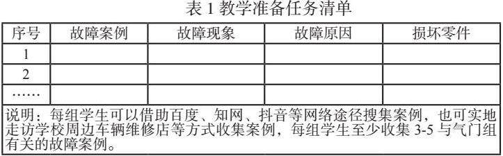 虽然翻转课堂要求学生在课前完成线上视频的学习,但为了提高视频学习效果,在组织学生线上视频学习之前,进行一定的课前准备,可以借助网络搜索进行相关话题的探究。由于与气门组有关的发动机故障案例较多,可以将学生按照宿舍分组,每组6名学生,完成教学准备任务清单(如表1所示),观看教学视频之前每组学生需提交该任务清单。