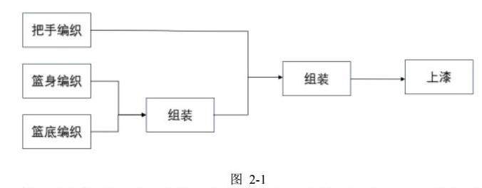 本文以竹编提篮的编织为例,该竹编提篮的制作流程如图2-1所示。该提篮的制作主要分为三部分六个环节。首先是把手、篮身和篮底三个部分的编织,其次是篮身和篮底的组装,再是把手和主体的组装,最后对成品进行上漆,自然风干后可以得到完整的产品。
