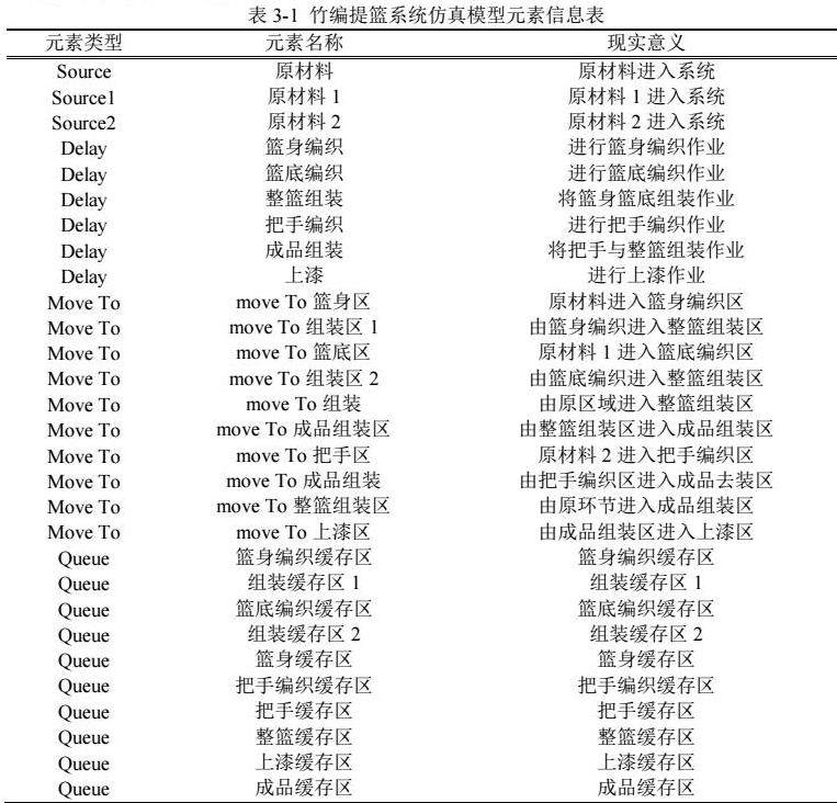 D企业竹编提篮生产系统仿真模拟过程中使用的实体元素以及各实体元素对应的名称和现实意义如下表3-1所示: