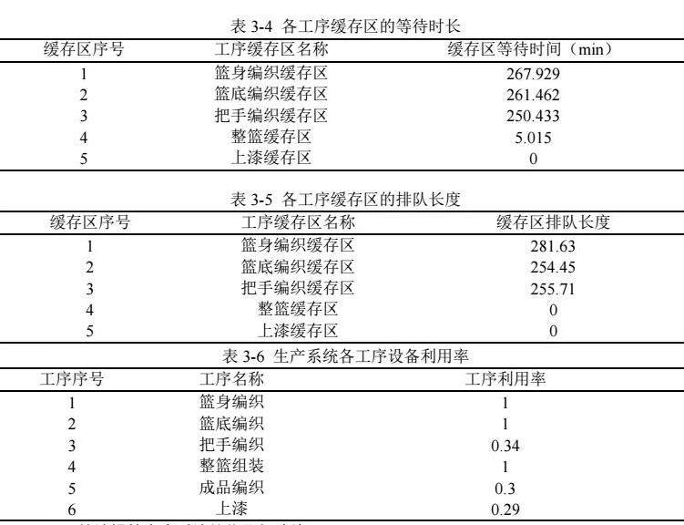 在建立好仿真模型后,需要对“已建立的模型,是否能够反映竹编提篮生产系统的运行”情况这一问题进行检验。主要通过比较仿真模型与实际生产系统中缓存区库存、缓存区等待时间以及各个工序的加工时间来进行。模型中的一单位表示现实的一分钟,根据该企业的生产时间进行计算,该模型的停止时间为:8*60*7=3360。当模型运行了3360个单位时间后,其仿真结果如图3-2所示。试运行后,我们可以发现建立的仿真模型可以顺利运行,运行后的产品生产周期、缓存区排队长度、设备的利用率等信息,与现实中企业现在的生产系统并无太大的出入,说明文中参数设置合理,可以反应现实中竹编提篮生产系统的真实运行情况。