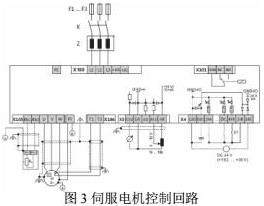 堆垛机XYZ轴的运动由3台伺服电机实现货物在库位中的存取,并分别由3台伺服驱动器独立控制。每台伺服电动机控制回路如图3所示,主要由强弱电回路构成。强电回路主要由熔断器F、断路器K组成,弱电控制回路在伺服程序的控制下,对伺服电机的位置进行控制。
