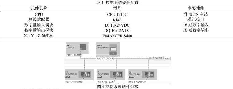 电气控制系统采用西门子的PN工业以太网系统,使PLC与现场设备实现信号控制与信息传输,同时通过TCP/IP协议,PLC与上层调度系统进行实时数据传输。根据堆垛机在运行中要有精确的定位功能,该控制系统采用Siemens-1200系列PLC实现功能,配置见表1。由中央处理器CPU1215C、DI 16x24VDC和DQ 16x24VDC组成主控制器,完成堆垛机运行过程中的所有控制信号输入、运算和输出,硬件组态如图4所示。