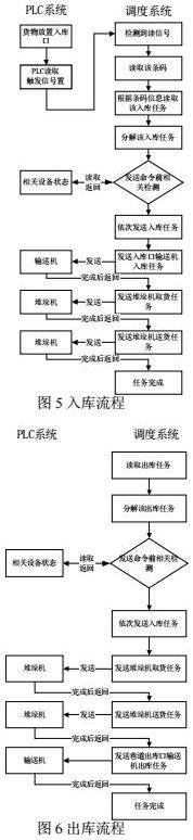 基于西门子TIA博图平台,根据系统工作原理,该控制软件要求能够接收调度系统的命令,并对输送设备、检测设备等进行自动控制,实现实时传递物流和数据信息,完成物料的入库与出库,出入库流程如图5,图6所示。
