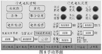 点击屏幕下方行走、提升、货叉按钮,进入手动操作页面,能够运用触摸屏界面的手动按钮操作堆垛机。在电机反馈这一栏中,显示的是各个伺服驱动器的状态信息以及货叉驱动器的状态信息和货叉居中情况。在电机控制这一栏中,通过触发按钮控制堆垛机各轴的运动方向,以行走电机举例,如图8所示。