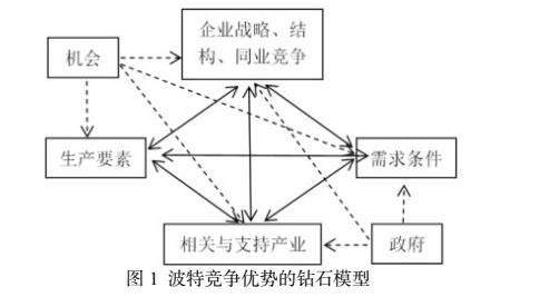 值得注意的是,政府和机会是外在的,是不可控制的因素;而生产要素、需求条件、相关和支持性产业则是双向互动。图1的单向剪头和双向剪头显现了各要素之间的关系。当然,政府也并非绝对意义上的不可控,如利益群体可通过一系列的措施影响政府政策走向。