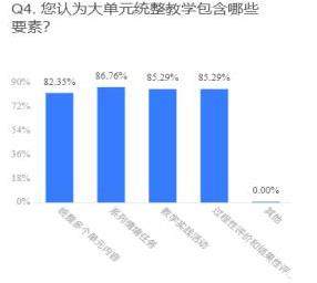 对于“大单元统整教学”的概念,大部分老师有较清晰、准确的认识。调查显示,80%以上的老师认为大单元统整教学包含统整多个单元内容、系列情境任务、教学实践活动、过程性评价和结果性评价等要素。