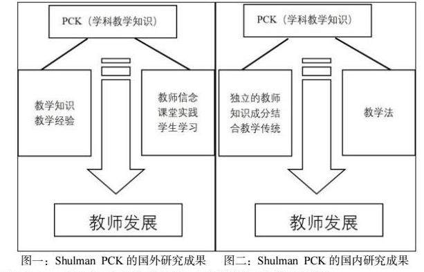 “Shulman 的 PCK”能否满足“全维课堂”教育引导模式?则需要清楚Shulman PCK在国外与国内教育中研究成果的变革性(如图一、图二)。通过对国外该研究成果分析:首先,它对传授者本身所具备的学科理论知识研究产生了一定的影响力,此后产生的大量教育理念、概念都是基于此,从某些方面来讲它推动了西方乃至全世界教师在教学中学科课程与教育课程的有效融合。其次,目的与内容的研究角度不同,大致有两种不同的研究方向,一类是探究了教师发展过程中的经验值如何影响学科教学知识的发展,另一类是以学科教学知识为理论依托有针对性的研究教师的教学实践,这也是PCK研究的价值所在。专家学者们以不同学科为研究对象,不同程度的论证了PCK对教师的信念、课堂实践以及对学生学习产生的影响。国内对PCK的研究并不常见,从成果分析来看主要针对两个方向的研究,一是“教师知识成分+学科教学传统”的研究;二是从教法上研究教学内容知识,这一点与上述国外学者对PCK的独立性争议有不谋而合之处。由此可见,无论是国外还是国内的PCK研究成果中,都弱化了学生思想行为特点对于教育教学的重要性,更多的是强调教师本身的发展对学科理论知识的推动作用,仅从这一点并结合上文图一可以说明Shulman 的 PCK不能有效满足“全维课堂”教育的引导模式。