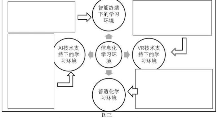 现代教学环境大致经过了三此演变:传统多媒体教学环境—数字化网络教学环境—信息化教学环境。三种教学环境隶属于不同时期的教育政策、政治文化态度、经济发展水平、科学发展技术以及学生的思想行为特点在育人模式中发挥着重要的作用,各有利弊,育人模式无谓好坏。针对当下信息化教学的时代需求以及新冠疫情的持续发生,多地高校采取了线上与线下随时转换的教育教学模式。各种信息化教学技术应运而生,但各个区域由于经济发展速度的快慢也造成了技术水平的差异。国内一线城市的教学环境基本能够满足社会对高素质人才发展的培养需求,而二线城市则较为迟缓,呈现出由数字化网络教学环境向信息化学习环境过渡的趋势。部分三线城市则仍然保留较为传统的多媒体教学环境。根据“全维课堂”育人模式对教学环境的要求以及在教育信息化2.0的推动下,目前高校主要采用4大类型的信息化学习环境:智能终端设备下的学习环境、AI技术支持下的学习环境、VR技术支持下的学习环境、普适化学习环境(如图三)。