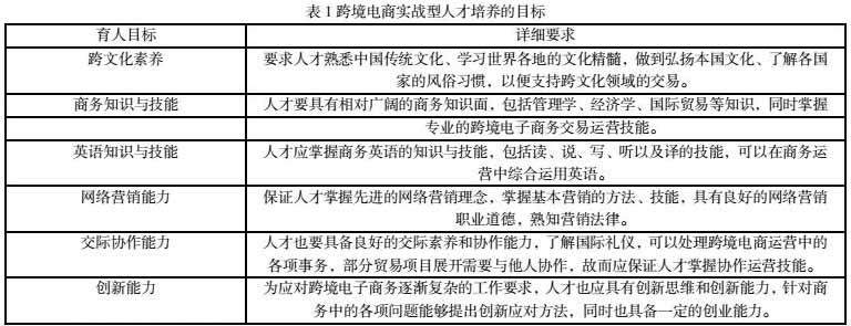 高校是跨境电商专业实战型人才培养的主要机构,在产教融合视域下,其需要先明确实战型人才培养的目标,对此,要对未来跨境电商产业发展的人才需求深刻洞察,以保证目标的制定更为科学,人才培养的方向更加正确。对当前跨境电商领域发展的动态分析可知,其正处于快速发展时期,市场的经营销售模式呈现出多元化,因而未来对贸易人才的要求也将不断攀高,尤其是实践实战能力较强的人才缺口较大,人才需求也具有迫切特性。跨境电子商务专业本身也属于不同知识交叉的一门学科,其涵盖了最基础的电子商务知识,但同时也融入了国际贸易的一些内涵,因此,相关人才不仅要掌握贸易往来的运营技能,还要对国外的交易市场、交易手段、人们消费习惯以及汇率等情况熟知,掌握一定的英语交流技能、计算机操作技能等,以保证满足跨境电商企业岗位工作的现实需求[5]。基于此,其实战型人才培养的目标可以设定为几点:①跨文化素养;②商务知识与技能;③英语知识与技能;④网络营销能力;⑤交际协作能力;⑥创新能力。目标的详细要求如表1所示。