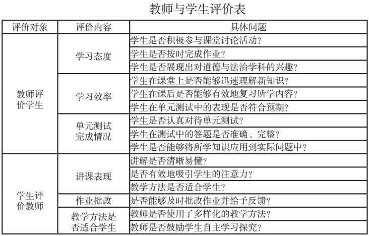 在大单元教学模式下,教师需要构建一个全面的评价体系来衡量学生的学习成效。这样的评价体系应当科学且合理,以便准确地评估学生掌握知识的程度。评价不应该只重视学生的学习结果,而是应该贯穿在整体教学之中,对学生进行全面的评价[3]。这样的评价体系有助于提高教学的有效性,确保学生在道德与法治课程中获得全面的发展。