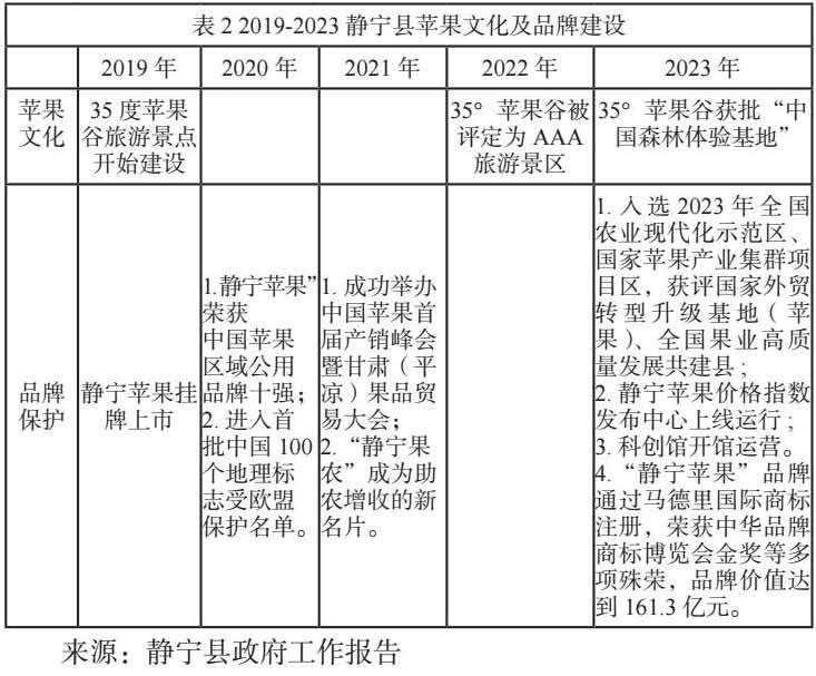 静宁县四十年谋一果,为苹果产业的发展凝心聚力、接续奋斗,做出了巨大努力,也取得了显著成效。就品牌保护而言,静宁苹果先后荣获“中华名果”、“全国食品质量消费者放心品牌”、“第十届中国国际农产品交易会金奖”等荣誉,被国家商标局认定为中国驰名商标,可以说静宁苹果已经成为静宁最靓丽的名片。围绕苹果的文化活动也是丰富多彩,有散文集《苹果花开的地方》、长篇小说《嫁果记》、诗歌《被一颗苹果喜欢过》等。每年如期开展静宁苹果节、苹果书画展、苹果主题摄影展等各类文化活动,可见苹果文化已渗透到静宁文化的方方面面。此外,依托苹果资源为载体的旅游产业也得到快速发展,静宁县35度苹果谷现为国家AAA级旅游景区,苹果采摘体验以及认领计划等都已成为网红旅游活动。2019—2023年静宁县就苹果文化和品牌保护情况如表2所示: