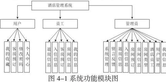 本系统本系统按权限划分为管理员、员工、用户三大模块,其中管理员权限最全面,可操作所有核心功能。具体的功能如图4-1下: