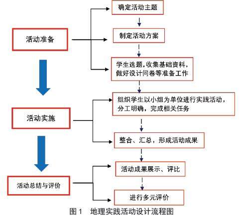 为了更有效、顺利地开展地理实践活动,可按照“活动准备”、“活动实施”、“活动总结与评价”三个阶段进行设计,具体流程见图1。