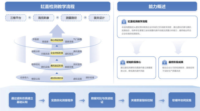 摘要:在制造业数字化转型与职业教育“岗课赛证””综合育人背景下,高职《精密检测技术》课程面临设备投入高、技术迭代快、实践教学难等现实困境。本文以汽车发动机缸盖检测为项目化教学案例,构建“虚拟仿真预训练- 真机实操验证- 企业标准对标”的教学流程。通过入PC-DMIS 虚拟仿真系统,设计包含三维建模、测量程序编写、误差分析的全流程教学项目,解决传统教学中“三高三难”痛点,为职业教育实践课程数字化改革提供可复制的实施范式。关键词: 虚拟仿真技术;精密检测;项目化教学;发动机缸盖