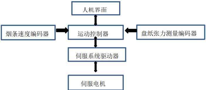 系统硬件主要包括:触摸屏、运动控制器、伺服驱动器、伺服电机、烟条速度编码器、纸张力测量编码器等。系统连接框图如图三所示: