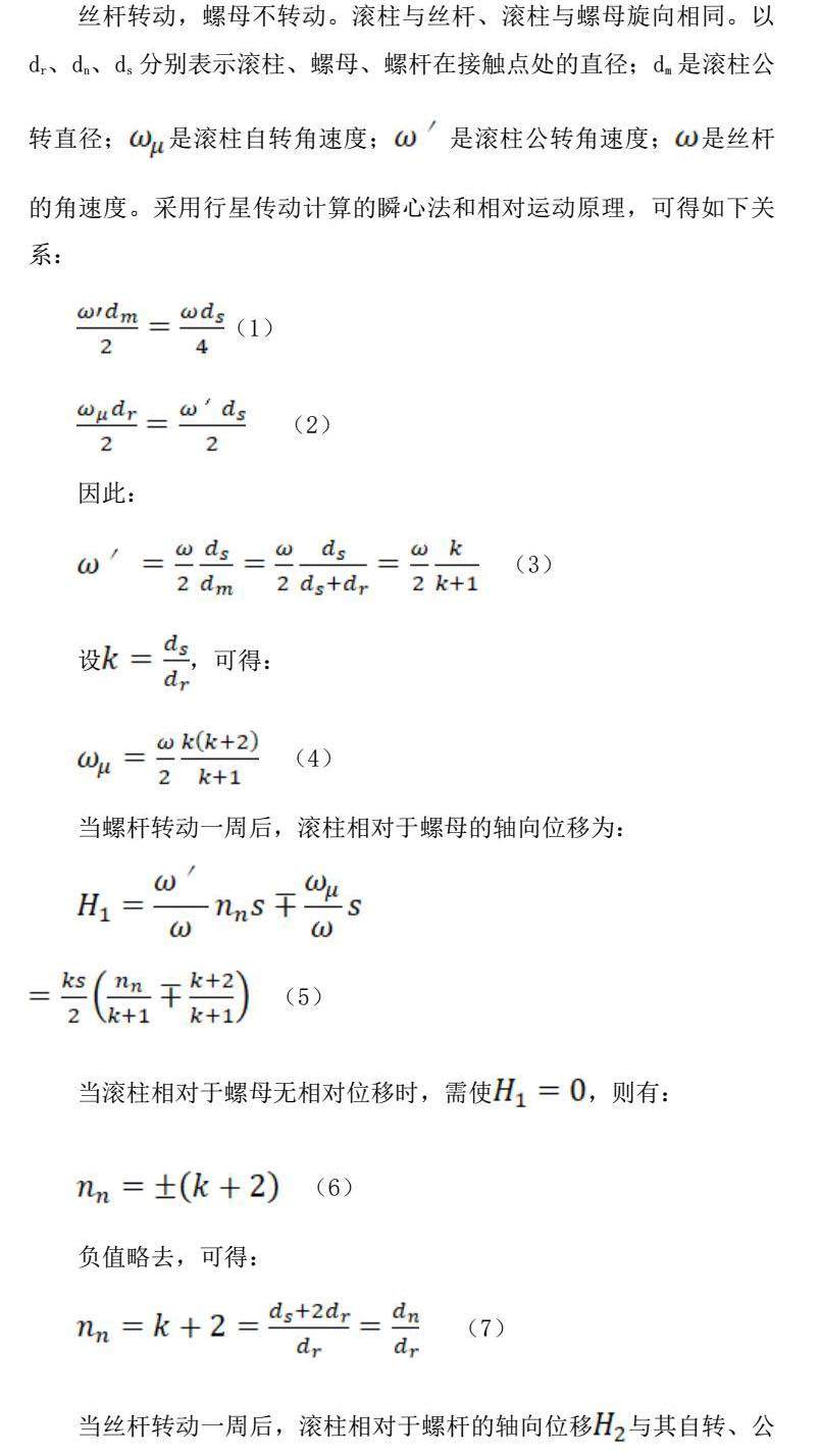 丝杆转动,螺母不转动。滚柱与丝杆、滚柱与螺母旋向相同。以dr、dn、ds分别表示滚柱、螺母、螺杆在接触点处的直径;dm是滚柱公转直径;是滚柱自转角速度;是滚柱公转角速度;是丝杆的角速度。采用行星传动计算的瞬心法和相对运动原理,可得如下关系: