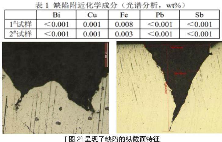 化学成分测试揭示,1#样本中异常增高的铁含量(0.008 wt%)可能指示了外源性污染,而2#样本杂质水平符合预期,提示1#缺陷的非原发性成因。