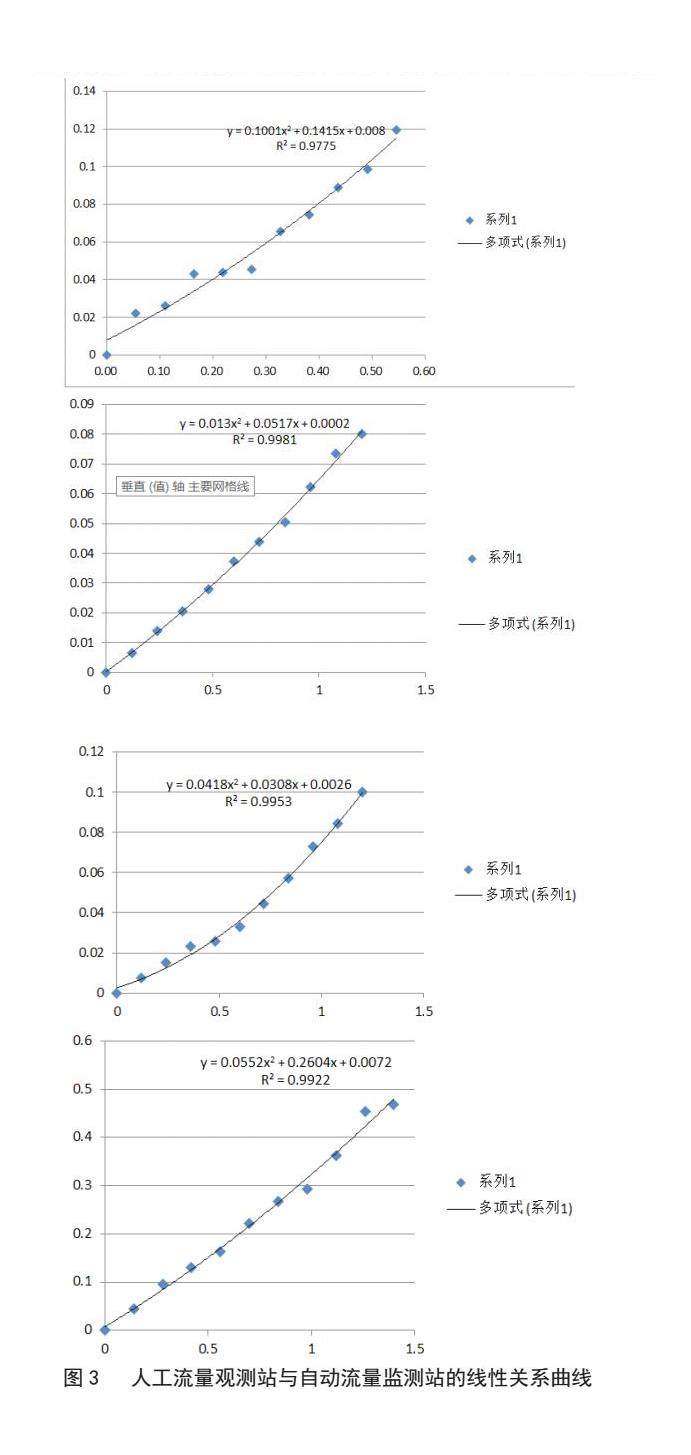 人工流量观测站与自动流量监测站的标准曲线与相关关系如表1所示:在合理的布点原则和对比分析下,人工流量观测站与自动流量监测站在数据上呈良好的线性关系。