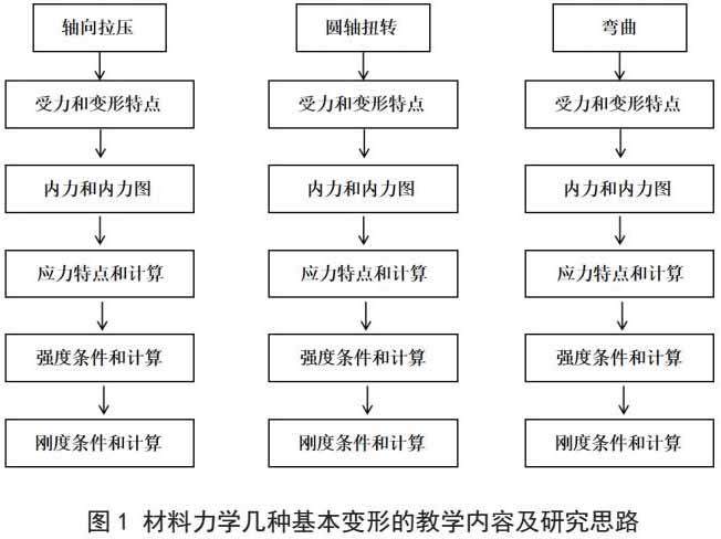 材料力学部分的教学内容及研究思路如图1所示,传统的教学思路是轴向拉压、圆轴扭转、弯曲三个基本变形各作为单独的主线教学,三条线依照时间顺序可以看成串联的形式,但是从图1中可以清楚看出,三种基本变形除了变形具体特点不同外,研究思路相同,研究方法类似,且每一个小知识点都是相同的。譬如在确定横截面上应力的方法和过程,均是通过变形特点,进行平面假定,在平面假定的基础上利用几何关系和特点,得出应变分布,结合材料的物性关系,得到应力分布,最后通过静力学方程,联立方程组得到应力公式。教师可以对一种基本变形的应力求解过程进行详细讲解,让学生结合线上平台的课程资源学习,以小组讨论和汇报的形式,对另外两种基本变形的具体应力公式进行推导。