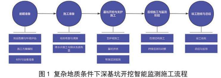 在工程竣工验收阶段,对整个施工过程中的监测数据进行全面整理和分析。汇总各阶段的监测数据,绘制监测数据的全过程变化曲线和图表,对基坑支护的稳定性进行综合评估。对竣工监测数据的分析,总结基坑支护在施工过程中的变形规律、受力特点以及与工程地质条件和施工工艺的关系。评估基坑支护设计方案的合理性和施工质量的可靠性,为类似工程提供经验参考。复杂地质条件下深基坑开挖智能监测施工流程如图1所示: