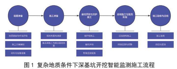 在工程竣工验收阶段,对整个施工过程中的监测数据进行全面整理和分析。汇总各阶段的监测数据,绘制监测数据的全过程变化曲线和图表,对基坑支护的稳定性进行综合评估。对竣工监测数据的分析,总结基坑支护在施工过程中的变形规律、受力特点以及与工程地质条件和施工工艺的关系。评估基坑支护设计方案的合理性和施工质量的可靠性,为类似工程提供经验参考。复杂地质条件下深基坑开挖智能监测施工流程如图1所示: