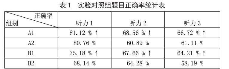 在智慧课堂环境下,利用智慧课堂生成A1和A2,B1和B2二组实验数据(表1),在控制相关变量的情况下,其中A1和B1组学生学习了相关听力策略知识,并在老师的引导下实践运用了所学听力策略;A2和B2组学生未进行听力策略知识的学习。实验结果证明A1和B1组学生听力答题正确率明显高于A2和B2组。因此智慧课堂环境下运用听力策略可以有效的提高答题正确率。