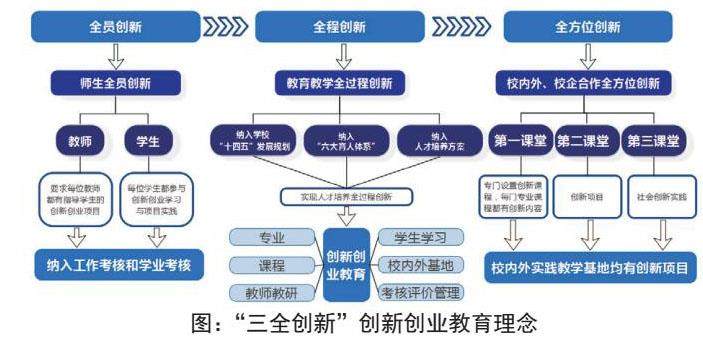 当前,我国创新创业教育已深入人心,然而同率先迈入创新驱动的国家相比,我国高校在创新创业工作上普遍存在着创新创业师生参与度不高、创新创业师资水平薄弱、师生共创能力不足、高校未建立创新创业全校一盘棋思想和行动举措、创新创业成果突出,但市场转化率较低等问题。我们处在创新的时代,经济社会发展急速转型,通过创新创业改造传统产业升级。要求培养具有创新创业能力的应用型人才,教师和学生人人皆有创新潜质,人人皆可创新,人人皆能创新成功。因此,“三全创新”创新创业教育理念在这个特殊时期应运而发,即全员创新、全过程创新、全方位创新。处于新旧经济发展方式变换的历史节点上,高等学校应不断提升对创新创业工作的和原理的认识整合思维,搭建平台,创造其可持续发展的生态系统,将大学生的创新创业精神和能力培养作为高等学校人才培养的内容之一,进而形成适应本土创新驱动,并能促进人的实际发展的创新创业理论与实践体系,使更多大学生成为具有创新精神的知识劳动者、面向知识要素的创业者和通过创新创业活动实现自我全面发展的人。高校必须承担起它应有的教育责任,建立与各自实际情况相符合的创新创业的生态系统,大规模地复制和再生产创新创业精神与能力。