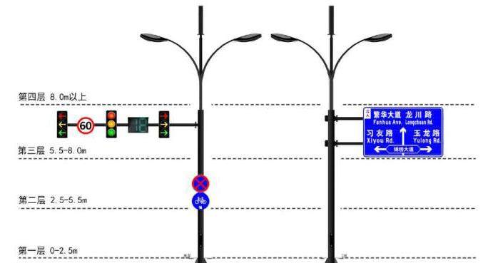 根据设施的功能和使用需求,将综合杆分为多个层次进行搭载: