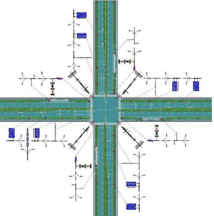 交口圆弧处布设中杆灯综合杆,布点宜设置在两个方向斑马线交汇处,同步搭载人行灯、交通监控、治安监控及左转待转信号灯等设施。交口出口道方向设置车行灯综合杆,同步搭载路灯、小型交通标志、路名牌等。交口进口道方向,在停车线后18-25米处设置电子警察综合杆,搭载路灯等设施,在交口展宽段及其上游根据交通标志设计规范设置分道行驶标志、指路标志与路灯综合杆,设置的点位可根据路灯布点位置前后调整。通信基站、公共WLAN、视频采集、紧急报警、环境监测、气象监测、信息发布显示屏、公共广播、充电桩等多类设备可根据实际需求搭载[4]。