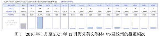 本研究所使用的 NOW 语料库是目前世界上最大的英语新闻语料库之一[11]。该库收录了2010年以来20个国家和地区的主流媒体发布的英语网络新闻,是了解世界主流英语媒体关注的热点议题及媒体观点的重要平台。因此,选取2010年1月至2024年12月海外英文媒体的涉胶报道语料为研究对象,主要研究问题有:(1)海外媒体话语在建构胶州城市形象时呈现了哪些语言特征?(2)海外英文媒体在文本和话语实践中建构了什么样的胶州城市形象?(3)根据呈现的语言特征,结合胶州的实际情况,可为胶州的城市形象提升提供何种策略建议?