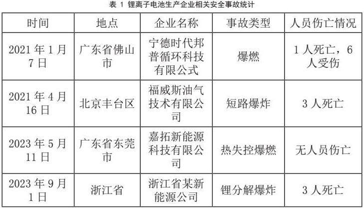 在“碳达峰、碳中和”战略目标推动下,新能源汽车产业快速发展,带动锂离子电池需求持续攀升。我国已成为全球最大的锂离子电池生产国和消费国,产业规模不断扩大。然而,锂离子电池作为高能量密度产品,其生产过程中存在显著安全隐患。由于材料特性和工艺复杂性,生产环节易发生自燃、爆炸等事故,可能引发严重火灾,造成人员伤亡和重大经济损失。随着行业快速扩张,企业数量激增,相关安全事故频发(见表1),安全风险管控面临严峻挑战。