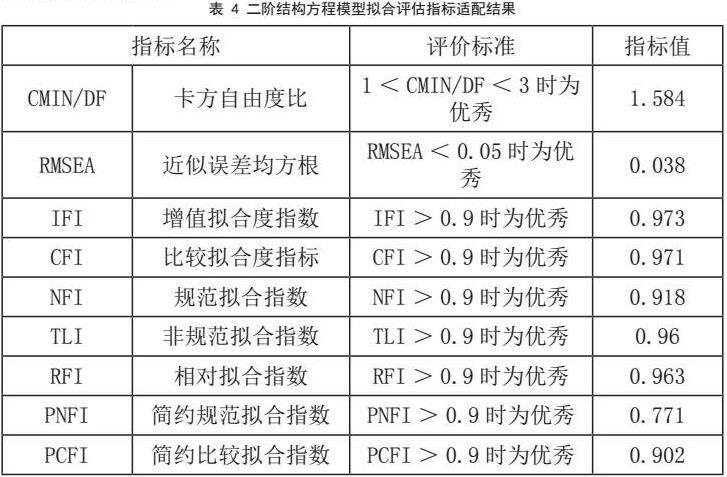 由上表可以看出,CMIN/DF 值为1.584,满足在1-3的范围内;RMSEA 值为 0.038,满足低于0.05 的标准;此外,IFI、CFI等值都超过0.9,从而可区分出模型具有优秀的适配度,本研究建立的结构方程模型在满足总体适配度的前提下,经过假设显著性验证,故模型和实际情况具有很好的吻合度。根据二阶结构方程模型图中各个二级评价指标的路径系数,代入权重计算公式,计算出各组一级指标下所对应全部二级指标的归一化权重,再将二阶结构方程模型结果图中各个一级评价指标的路径系数,代入权重计算公式,经过整理所得评价指标的权重见表[7]: