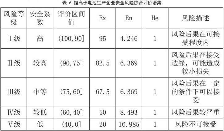 根据相关国内外文献研究、安全评价标准规范,并结合施工相关专家的意见,本研究将锂离子电池生产企业的风险水平分为Ⅰ-Ⅴ级风险,随着风险等级的提升,安全水平逐步降低。根据风险的分级建立锂离子电池生产企业施工安全风险评语集[9]。