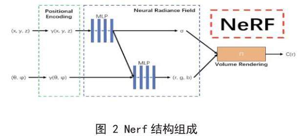 神经辐射场是一种基于深度学习的三维重建技术。其核心是利用多层感知机对场景的体积密度和颜色分布进行建模。输入为从不同视角拍摄场景的 2D 图像以及对应的相机位姿信息,将空间中某点的坐标及其观察方向编码为 5D 向量输入 MLP,经多层非线性变换,输出该点处的体积密度和颜色信息。通过体渲染技术,将沿光线的各点密度和颜色信息累积,生成对应视角的 2D 图像,迭代优化模型参数,使渲染图像与输入图像尽可能相似,从而实现从稀疏 2D 图像构建高逼真 3D 模型。NeRF 网络主要由多层感知机构成。输入空间点坐标 (x, y, z) 及其观察方向 (θ, φ) 组成的 5D 向量,经多层全连接层非线性变换,输出该点的体积密度 σ 和颜色信息 (cr, cg, cb)。网络通过大量图像数据训练,调整参数使渲染图像与真实图像误差最小化,学习场景中复杂几何与外观信息。