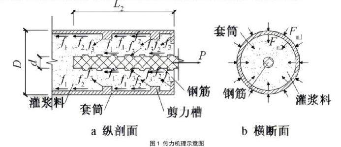 钢筋套筒灌浆连接技术的核心机制在于,首先将附带肋条的钢筋置入一个设计为中空结构的套筒内,随后制备高强度又具备早期强度加速特性的灌浆材料,将其灌注于钢筋与套筒间的空隙中,凭借灌浆材料特有的微膨胀能力[2],激发并传递出正向的压力效应,作用于套筒的内壁及接触的钢筋表面[1]。在实际操作过程中,优选采用的钢筋种类为带肋型,其表面设计有增加摩擦力的粗糙纹理,这一设计增强了钢筋与周围结构间的摩擦力水平,从而确保钢筋轴向力的传递,构成顺畅的传力路径。传力机理示意图如图1所示。
