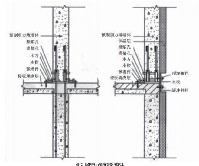 针对仓体底部存在的接缝,采用预埋定位螺栓结合模板的方式,实现了高效且可靠的封堵效果。对于具有两层结构的预制剪力墙板,一旦发现裂缝,立即采用模板环绕四周进行严密封堵。在模板安装过程中,特别注重在上下两层墙板间预先埋设螺栓,通过紧固这些螺栓,不仅强化了外侧模板的稳固性,还利用楼板内预置的螺栓与木楔,灵活调整内侧模板至精确位置,随后进行稳固固定。在内墙板的封堵作业中,选择木楔与方木模板作为封堵材料,确保所选材料尺寸适宜并准确安装到位。以预制剪力墙底部裂缝的封堵为例,预制剪力墙底部封堵施工如图 2 所示。