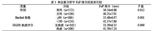 单因素分析中FoP得分的差异比较结果如表1所示。