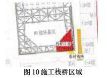 W1地块基坑东南角出土口距离3#楼与13#、14#楼较近,基于对周边建筑物的保护和现场实际情况,本工程出土口在基坑东南角角撑位置,以角撑栈桥板区域为主并对其进行了延伸。延伸范围如图10所示。通过设置施工栈桥及其延伸部分,缓解场地内车辆行驶空间紧张的情况,增加挖土工作面,减少基坑周边地面荷载,降低车辆运输期间对基坑及周边土体的扰动。