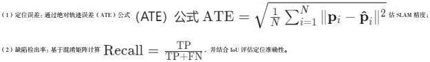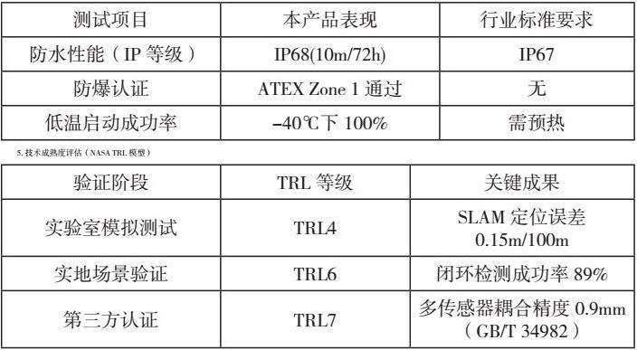 (1)实验室阶段(TRL3-4):模拟环境下验证SLAM定位误差(0.15m/100m)、缺陷识别mAP(91.3%);
